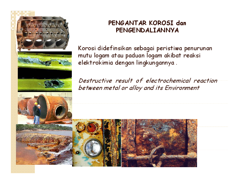 Korosi adalah proses degradasi atau kerusakan pada material logam akibat reaksi kimia dengan lingkungan sekitarnya. Proses ini terjadi melalui tahapan seperti pembentukan sel elektrokimia, oksidasi dan reduksi, serta pembentukan produk korosi. Faktor-faktor seperti kelembaban, oksigen, tingkat keasaman, dan suhu dapat mempercepat laju korosi.