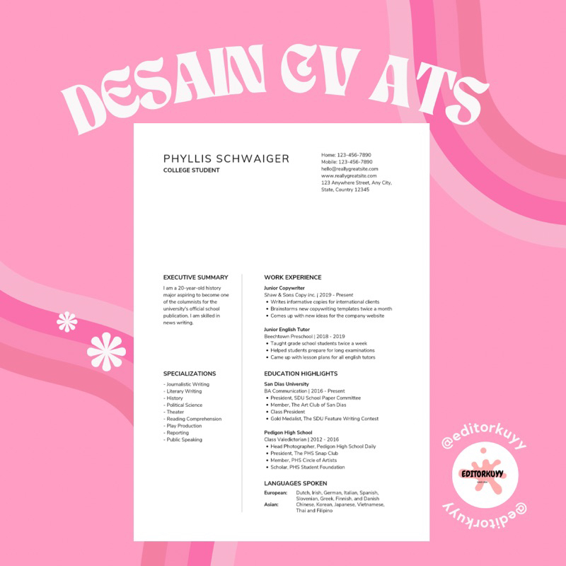 Gunakan font seperti Calibri, Helvetica, Lato, Cambria, Verdana, Georgia, dan Arial. Hindari font yang terlalu unik atau sulit dibaca.