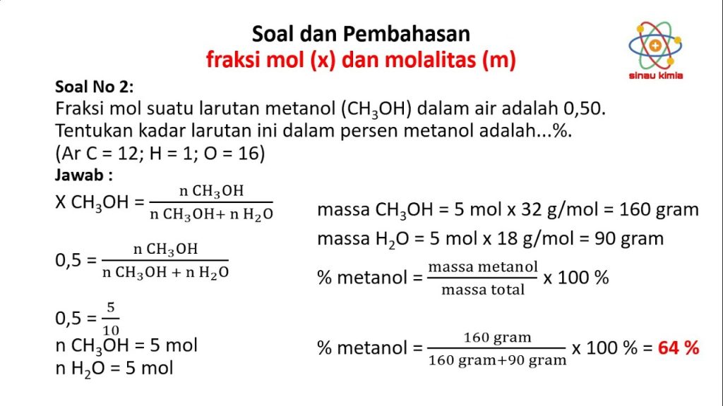 Selain itu, fraksi mol juga memiliki keunggulan dalam penggunaannya untuk menyelesaikan soal-soal kimia yang melibatkan campuran gas, larutan, atau reaksi kimia. Dengan memahami cara menghitung fraksi mol, kita dapat menentukan proporsi komponen dalam campuran secara akurat dan efisien. Artikel ini akan menjelaskan secara rinci pengertian fraksi mol, rumusnya, serta cara menghitungnya melalui contoh soal dan pembahasan yang mudah dipahami.