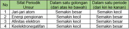 - Dalam satu periode: Sifat logam menurun dari kiri ke kanan. Elektron terluar semakin sulit dilepaskan.