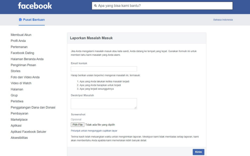 Jika masalah berlanjut, hubungi layanan pelanggan Facebook melalui halaman bantuan resmi mereka. Mereka bisa memberikan solusi spesifik berdasarkan situasi Anda.